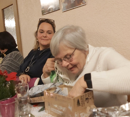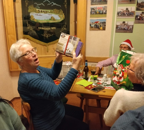 Am Ende waren alle Pakete aufgeteilt und die Spannung stieg ins Unermäßliche. Alle wollten endlich ihr Geschenk auspanken. Keiner konnte es mehr erwarten und wollte wissen was in dem bunt eingepackten Karton vor ihm ist. Damit auch alle teilhaben konnten, wurden die Geschenke von Jedem einzeln der Reihe nach ausgepackt. Dabei erblickten viele schöne Dinge das Tageslicht. Diese vielen liebevoll verpackten Kleinigkeiten sahen dabei so garnicht nach "Schrott" aus. Es waren allerhand schöne und nützliche Geschenke die den Besitzer wechselten. Alle haben sich große Mühe gegeben, um einem anderen Vereinsmitglied eine Freude zu bereiten. Während des Auspackens kam auch von dem Einen oder Anderen die eine oder andere lustige Bemerkung und sorgte dadurch für einen schönen Lacher.
