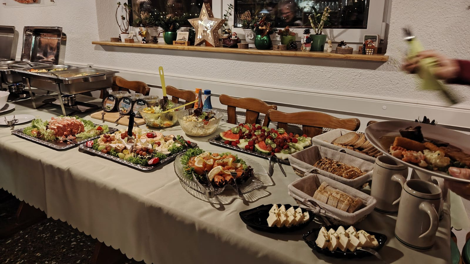 Während die Gäste ihre ersten Gläser tranken und sich Gesprächen und Plaudereien widmeten, richteten die Mädels vom Siedlerheim ein reichhaltiges Buffet mit allerlei warmen und kalten Köstlichkeiten an. Sie hatten sich wieder selbst übertroffen. Es war ein sehr leckeres Essen. Da konnte man sich überhauptnicht entscheiden. Also wurde von jedem probiert. Und am Ende waren wir mehr als satt.🤤