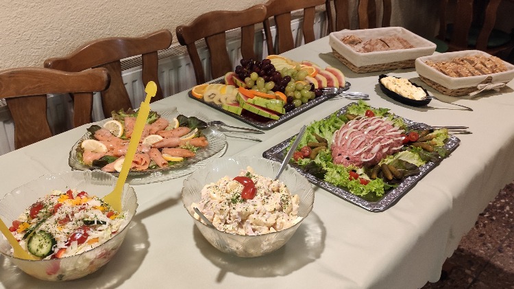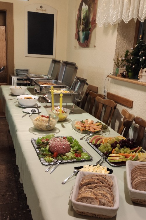 Es wurde uns ein reichliches Essen vom Buffet angeboten. Die Wirtsleute hatten mit viel Liebe warme und kalte Speisen im weihnachtlich geschmückten Siedlerheim aufgetischt.