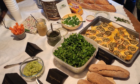 Zum Abschluss unserer praktischen Pflanzenkunde war im Vereinsheim ein Buffet zur Verkostung aufgebaut. Auf frischem Brot und Baguette konnten wir unter anderem Giersch Pesto, Apfel Meerrettich, Kräuterbutter und Brunnenkresse Frischkäse versuchen. Auch Kräuterwasser stand zur Selbstbedienung bereit und nicht zu vergessen mein Favorit: Blätterteig Kräuterschnecken.