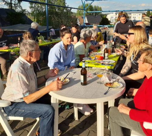 Im Verlauf der späten Nachmittagsstunden gesellten sich dann nach und nach immer mehr Gartenfreunde zu den Teilnehmern. Jeder trug einen kleinen Anteil zum Buffet herbei So entstand ein vielfältiges Angebot auf der Tafel und auf dem Grill. Die Versuchung war groß, von jeder Schüssel wenigstens eine Kleinigkeit zu verkosten. Unser „Grillmeister“ hat sein ganzes Können gezeigt! Zu den zarten Steaks, krossen Rostern und den auf den Punkt gegarten Grillkäse konnte trotz des vorherigen Kuchenverzehrs keiner konsequent „Nein“ sagen. Die Gläser wurden mit den mitgegbrachten Getränken gefüllt und es wurde auf die kommende Gartensaison angestoßen. Solch eine Feier ist immer ein guter Anlass mit den Gartenfreunden der Sparte ins Gespräch zu kommen und die Beziehungen innerhalb des Vereins zu vertiefen.