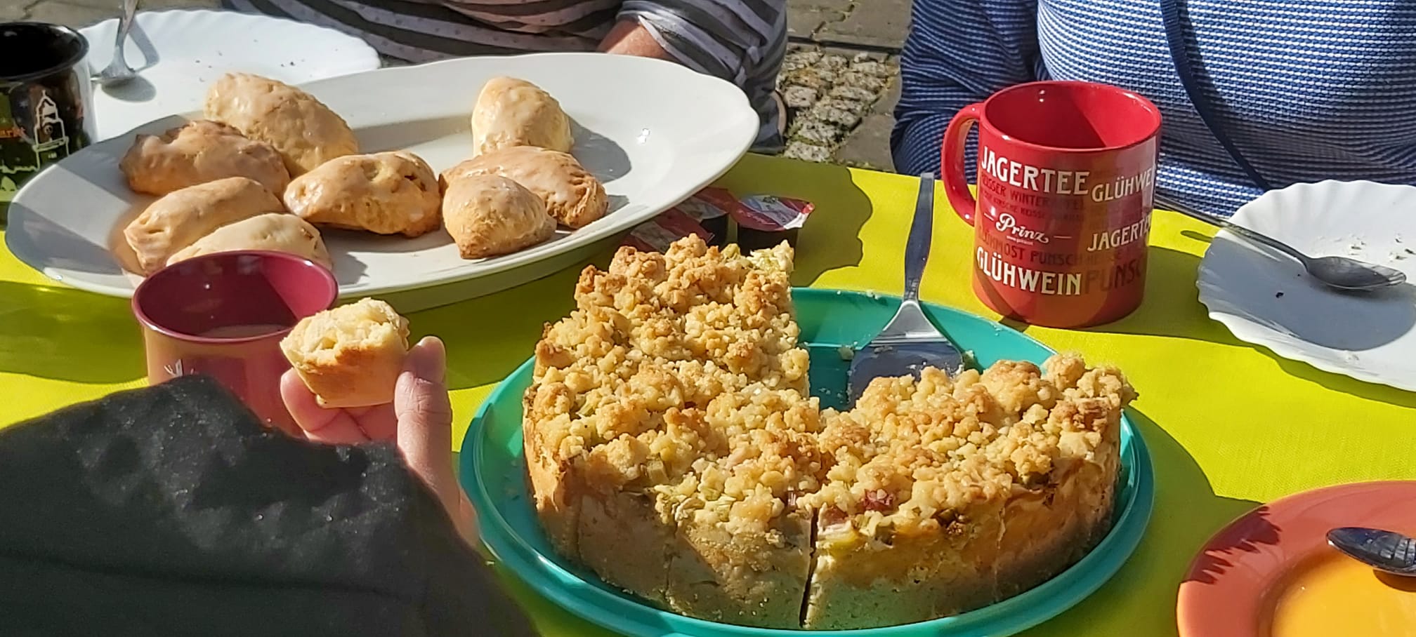 Die Eröffnungsparty am Nachmittag verlief jedoch dagegen besser. Zu Beginn haben sich einige Frauen zusammengefunden und bauten entspannt eine Kaffeetafel auf. Die zur Bastelrunde gefertigte Tischdeko fand hier auch gleich ihre Verwendung. Der lockere Start in die Saisonauftaktsfeier bei herrlichem Sonnenschein mit einer Tasse Kaffee, verschiedenen Kuchensorten, netten Gesprächen und teilweise einem anregenden Getränk, vermittelte eine angenehme Atmosphäre der Zusammengehörigkeit.