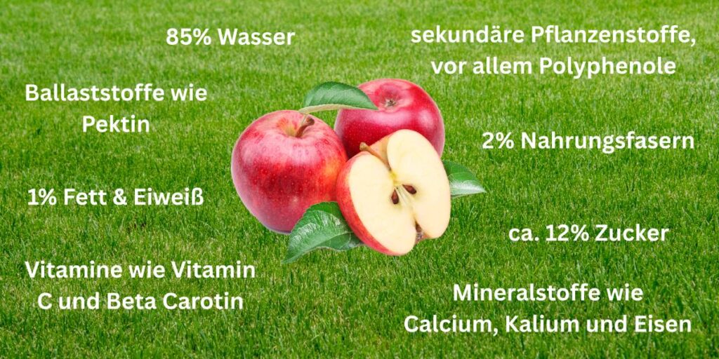 Durch den hohen Wasseranteil ist der Apfel ein erfrischender „Snack“ und trägt zur Flüssigkeitsversorgung in unserem Körper bei. Vitamine stärken u.a. unser Immunsystem, sorgen für eine schöne Haut und ein gutes Sehvermögen. Über die Nahrungsfasern, also Ballaststoffe in der Frucht, freuen sich unsere Darmbakterien und bedanken sich mit einer guten Verdauung bei uns. Einer dieser Ballaststoffe übrigens ist das Pektin. Das Apfelpektin nutzen wir zum Herstellen von Konfitüre. Der Zucker im Apfel, vor allem Fruchtzucker, liefert uns zwischendurch schnelle Energie. Und die sekundäre Pflanzenstoffe schützen nicht nur die Frucht, sondern auch uns. Das sind vor allem die sogenannten Polyphenole. Auch sie unterstützen das Immunsystem und bewahren uns vor Erkrankungen des Herzens und Krebs.