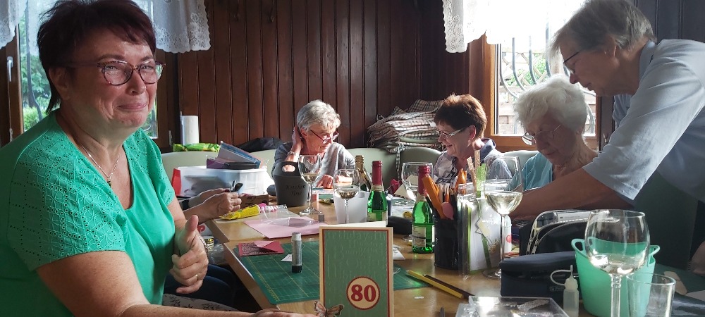 Wie man unschwer erkennen kann, hatten wir neben Schneiden, Kleben und Stempeln auch einen guten Anlass, mit einem Gläschen anzustoßen.