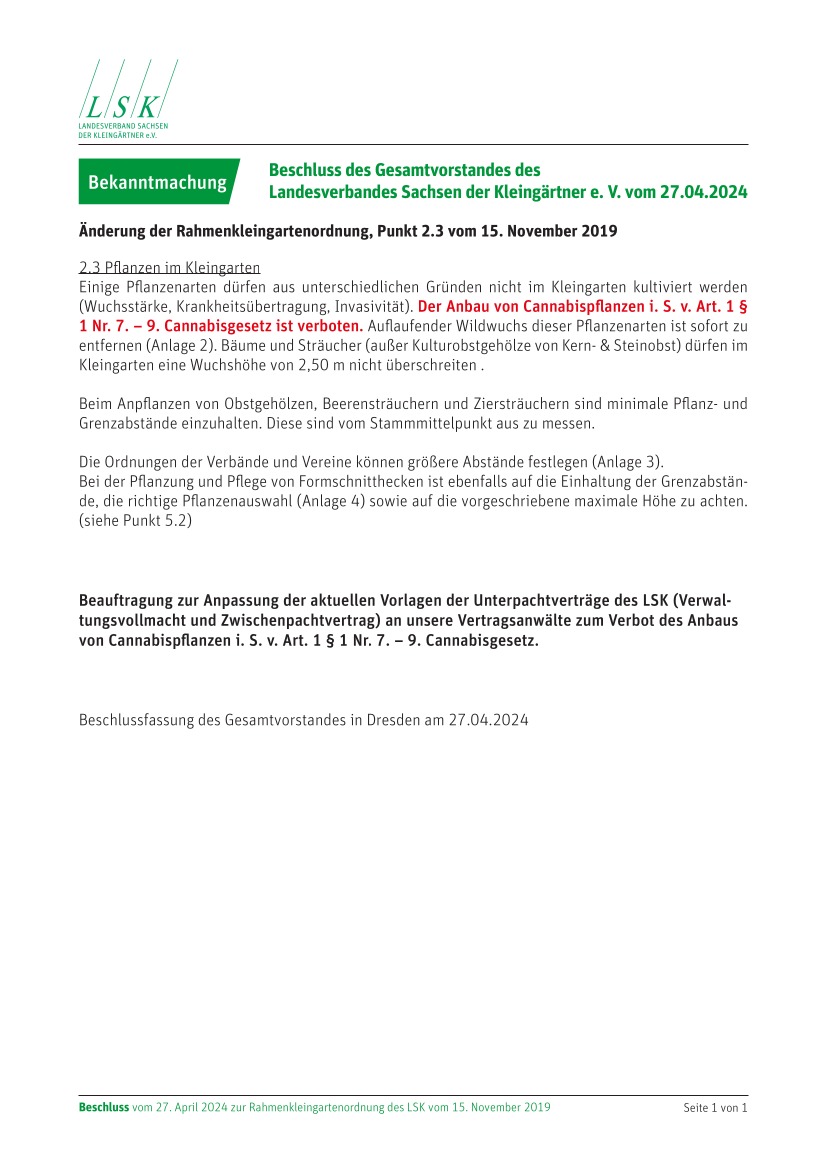 Da ein Kleingartenverein bzw. der Garten ein öffentlicher freizugänglicher Raum ist, kann prinzipiell der Zugang zu den Drogen durch Minderjährige nicht eindeutig verhindert werden. Und dies entspräche nicht den gesetzlichen Vorgaben der Bundesregierung in dem neuen Gesetz. Deshalb hat der "Landesverband Sachsen der Kleingärtner e.V" am 27.04.2024 einen Beschluss über den Anbau von Cannabis gefasst und eine Anpassung der Rahmenkleingartenordnung durchgeführt.