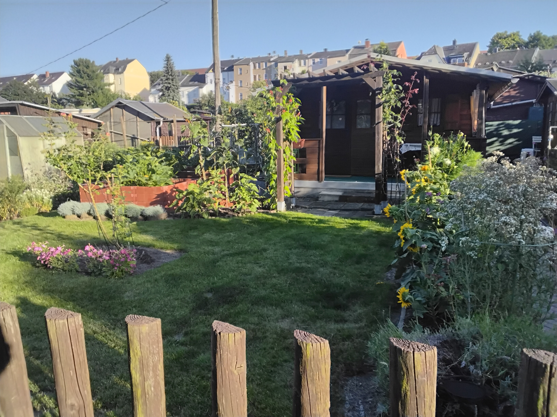 Die Parzelle wurde durch den Vorpächter nur wenig genutzt und bearbeitet. Somit steht eine große Rasenfläche für das Anlegen neuer Beete zur Verfügung.
